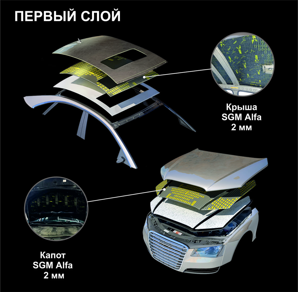- Включает в себя проверенные временем высокоэффективные вибродемпфирующие материалы для первого слоя – SGM Alfa толщиной 2-3 мм.