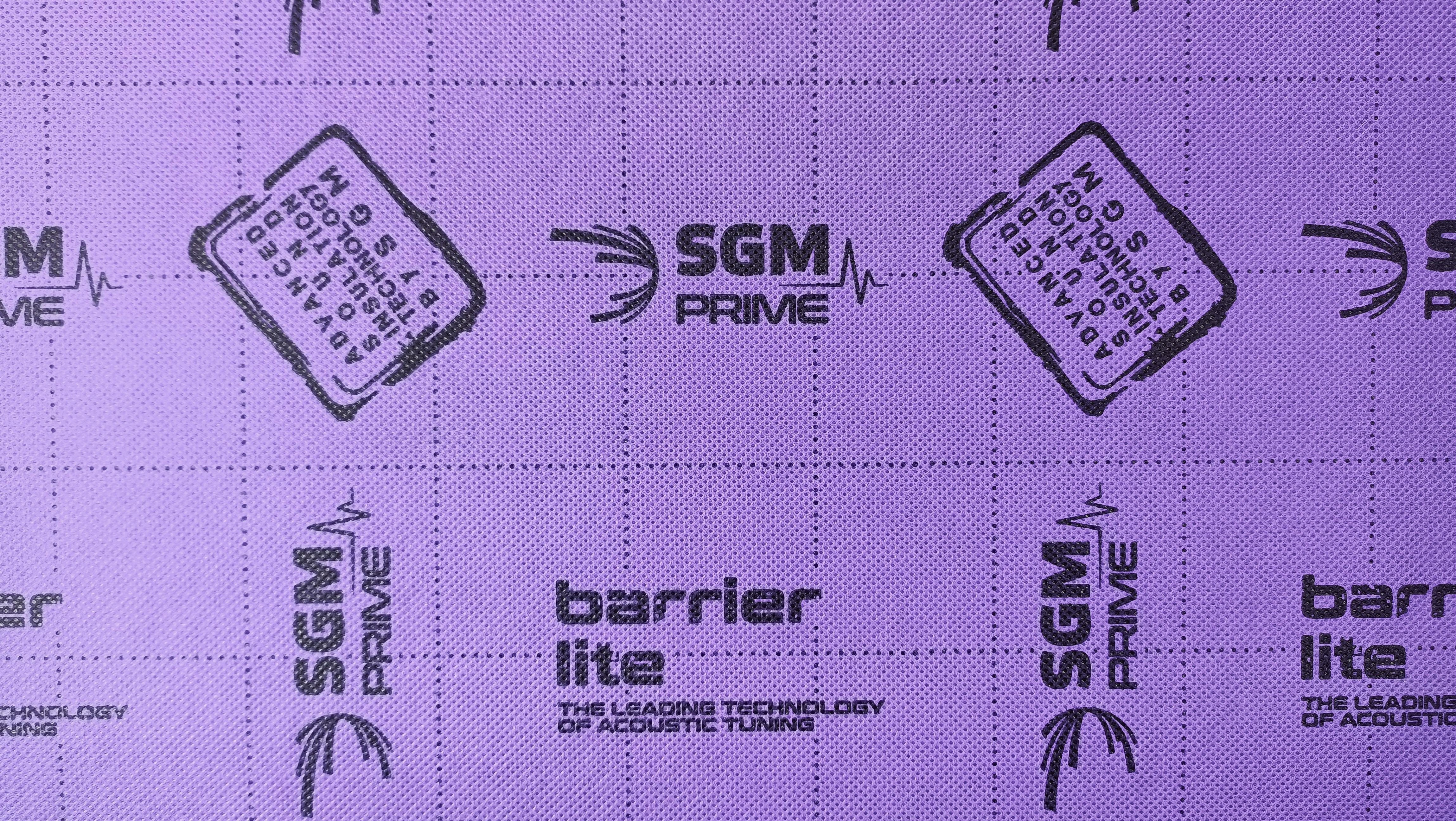 Эффективность материала обусловлена правильно подобранными толщинами и плотностями составляющих его слоёв, а абсолютная влагозащита материала гарантирует высокую эффективность его работы на протяжении всего срока службы автомобиля.Лицевой защитный слой состоит из специальной водонепроницаемой мембраны светло-фиолетового цвета с нанесенным рисунком в виде логотипа SGM Prime. Шумопоглащающий слой состоит из специального газовспененого пенопоэлитиоена с наночастицами и двух слоем полимерной мастики. Монтажный слой мастики самоклеящийся с высокими показателями адгезии. Защищен специальной силиконизированной бумагой.